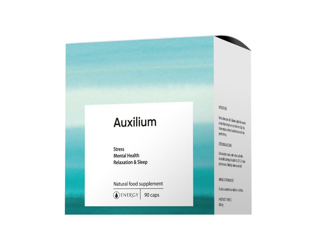 Doplněk stravy. Auxilium je čistě přírodní produkt. Obsahuje hořčík a vitánii snodárnou (ashwagandha - indický ženšen), která pečuje o vaše duševní zdraví. Dále obsahuje rozchodnici růžovou (rhodiola), jenž podporuje nervový systém a napomáhá zvládat únavu a stres. Levandulová esence zajišťuje lepší spánek a celkový pocit uvolnění a relaxace.