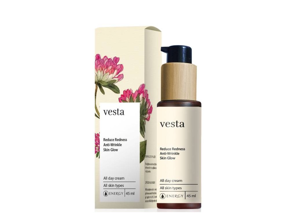 Vesta v sobě snoubí sílu tradiční fytoterapie, moderní biotechnologie a aromaterapie, díky nimž poskytuje dokonalou péči zarudlé pleti či pleti s kuperózou, která trpí nedostatečnou pevností a pružností krevních kapilár. Krém je lehký, dobře vstřebatelný, hydratační, zklidňující a pocitově ochlazuje pleť. Díky vysokému obsahu synergického komplexu bylin a dalších účinných látek blahodárně ovlivňuje regeneraci a dobrý stav všech vrstev pokožky. Výborně působí i proti vráskám a předčasnému stárnutí pleti. Je rovněž nejlepší volbou zklidňujícího pleťového krému po opalování.